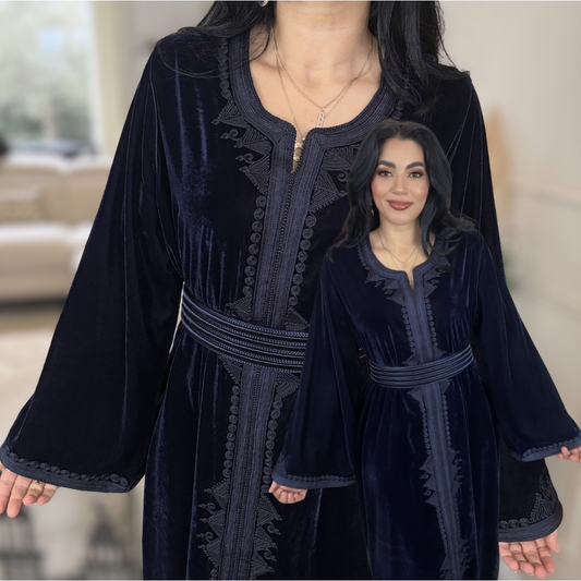 J’ai acheté cette gandoura. Je suis trop contente. Elle est magnifique en couleur bleue pétrole. Le mélange des tissus crêpe fluide et du velour embossé donne un raffinement à cette tenue.