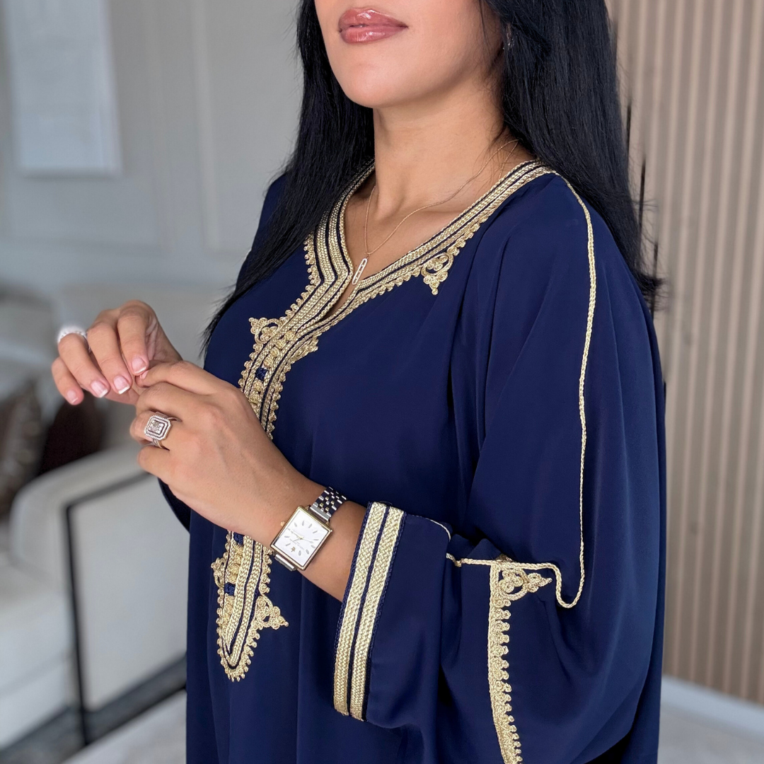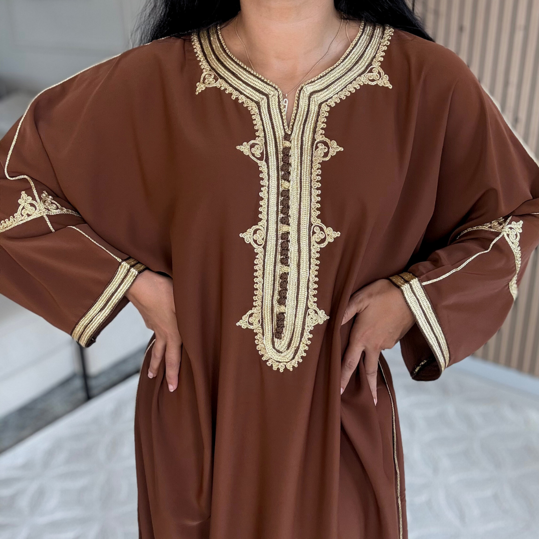 Confectionnée dans un tissu léger au tombé parfait, elle est sublimée par une broderie marocaine traditionnelle en fil skalli doré. Sa coupe ample convient à toutes les morphologies, du S au XXXL, pour un rendu aussi chic que confortable.