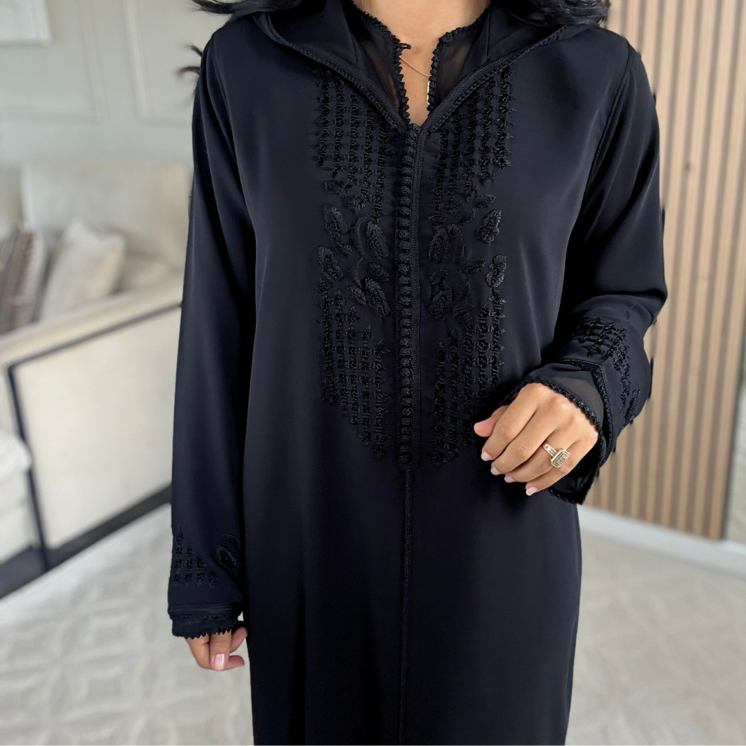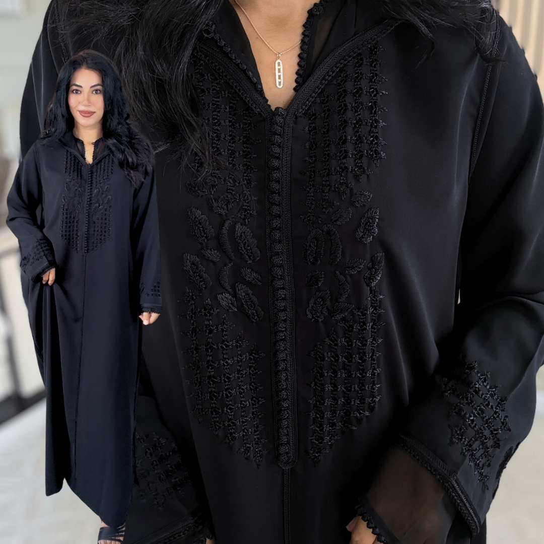 Une jellaba en crêpe de soie, fluide et élégante, avec un tombé naturel qui accompagne chaque mouvement.