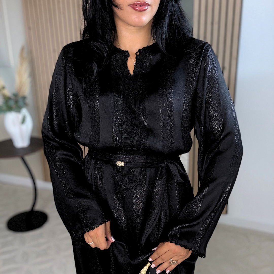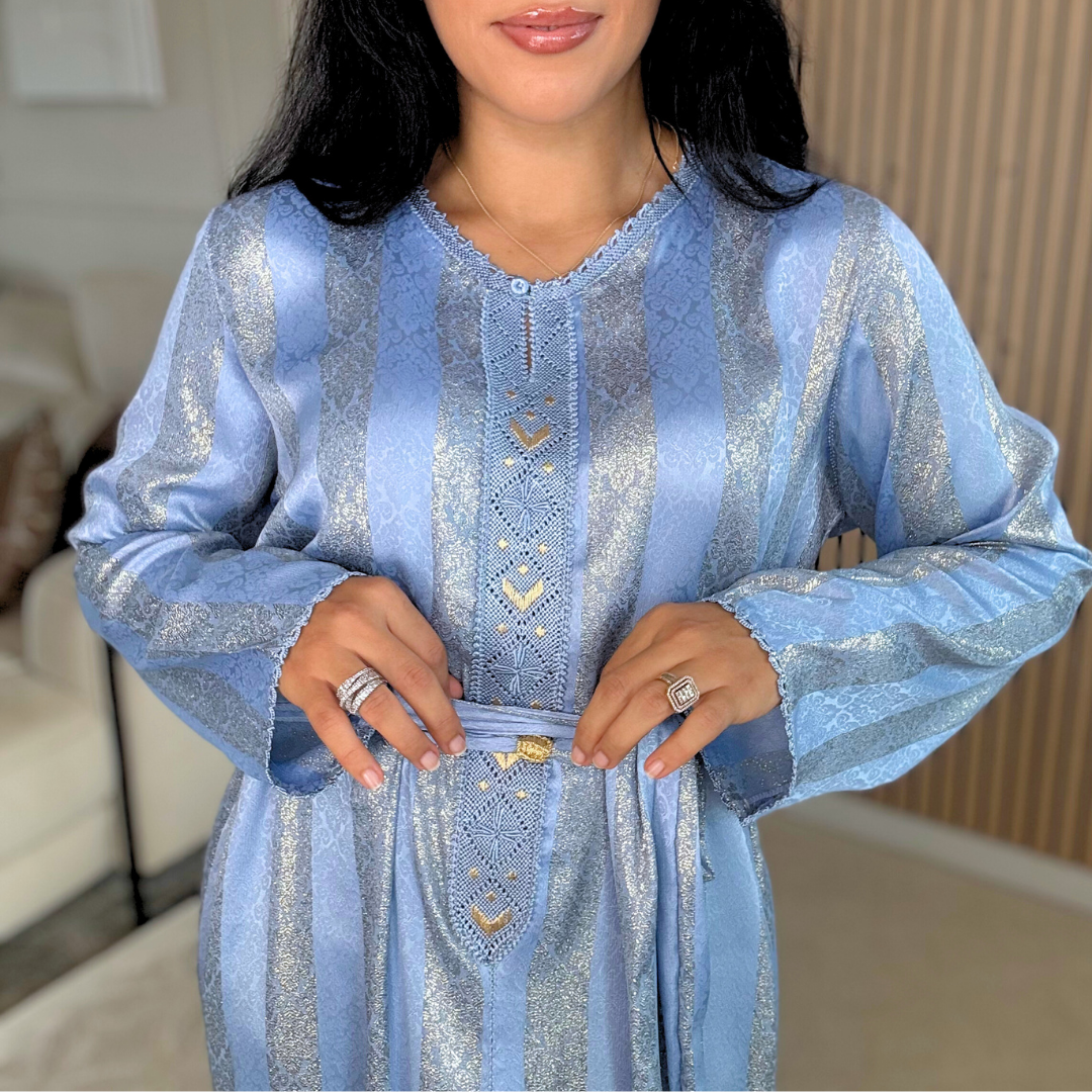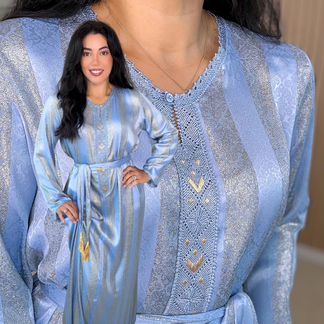 Le tissu Jawhara, à la fois fluide, lumineux et structuré, donne à chaque robe une allure précieuse, élégante sans en faire trop, parfaite pour les occasions mais aussi pour celles qui aiment porter du beldi au quotidien.