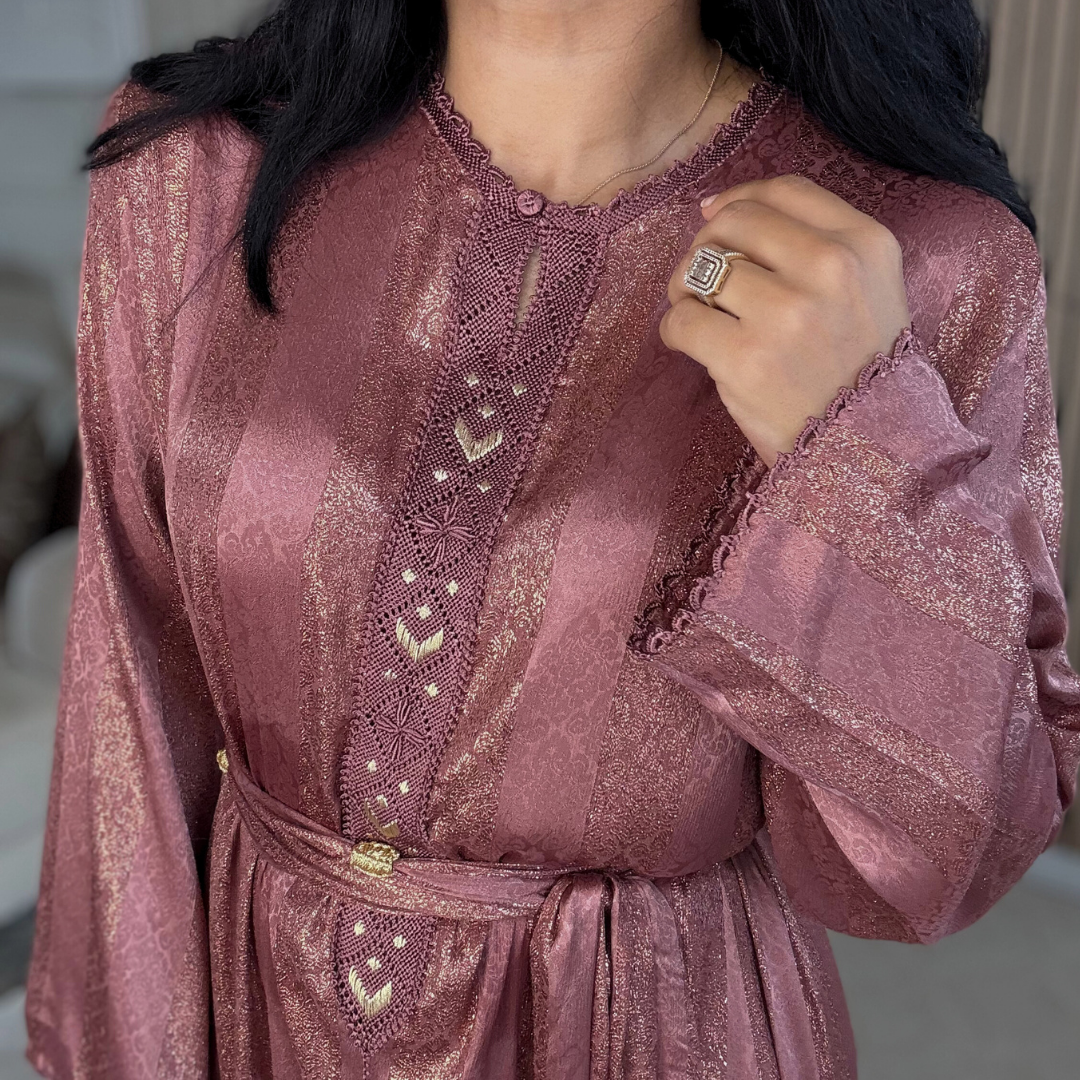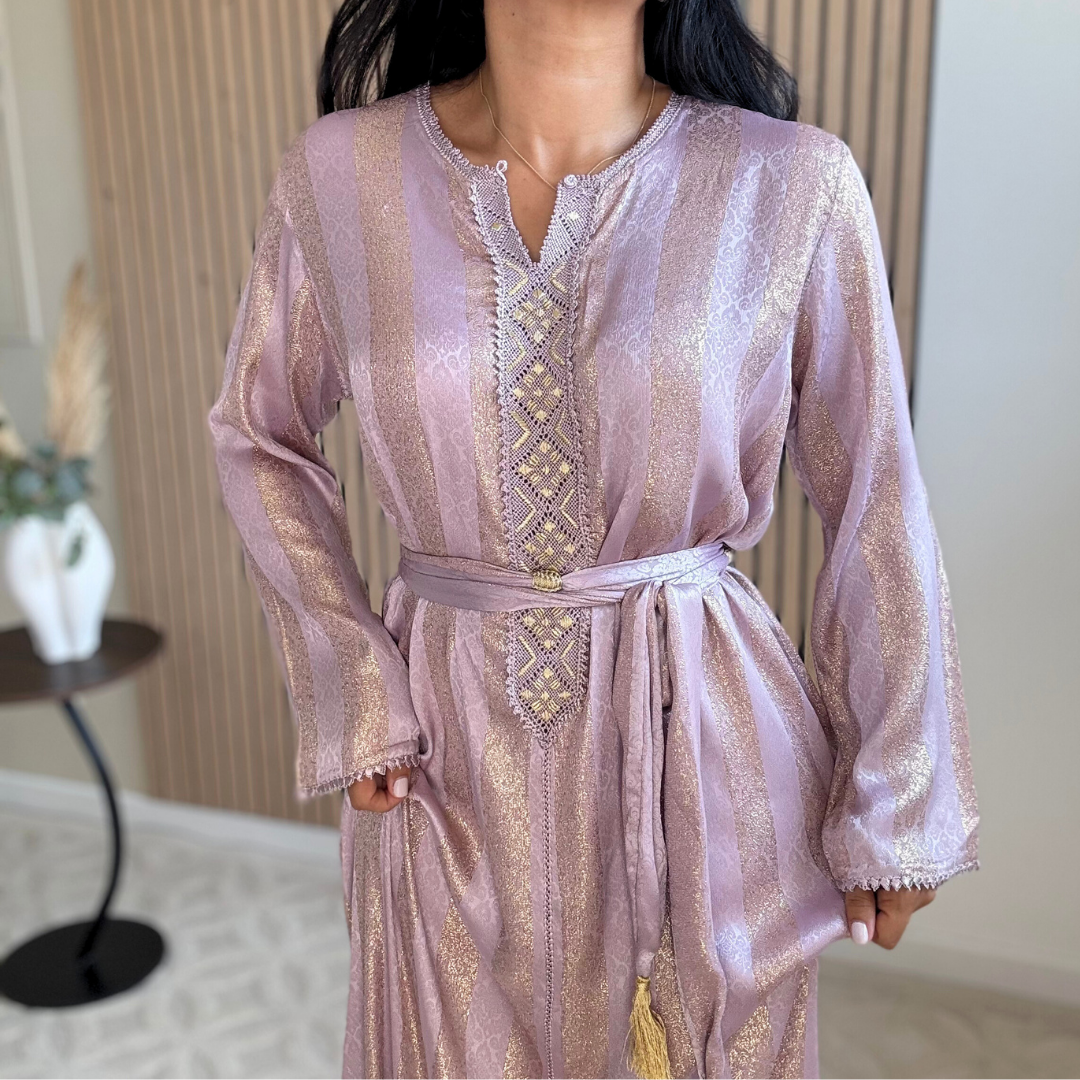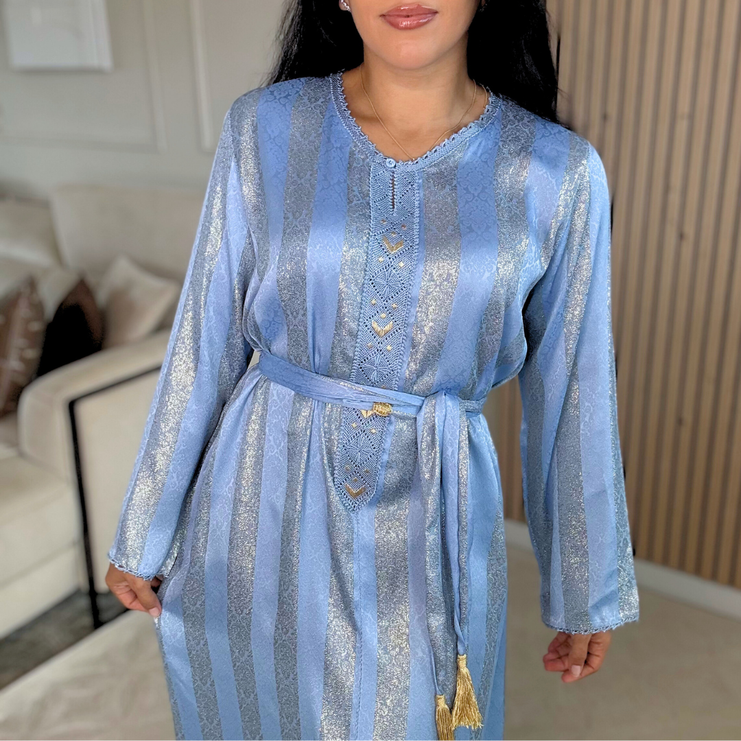 Le tissu Jawhara, à la fois fluide, lumineux et structuré, donne à chaque robe une allure précieuse, élégante sans en faire trop, parfaite pour les occasions mais aussi pour celles qui aiment porter du beldi au quotidien.